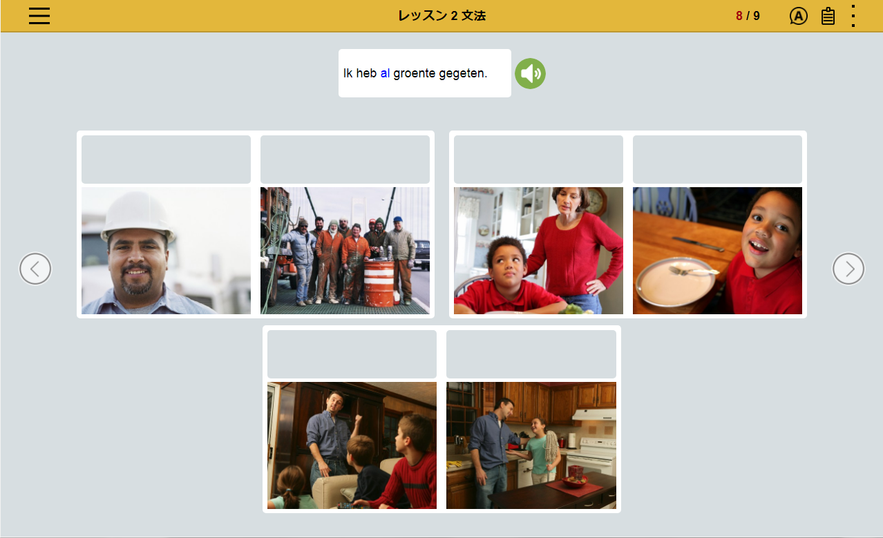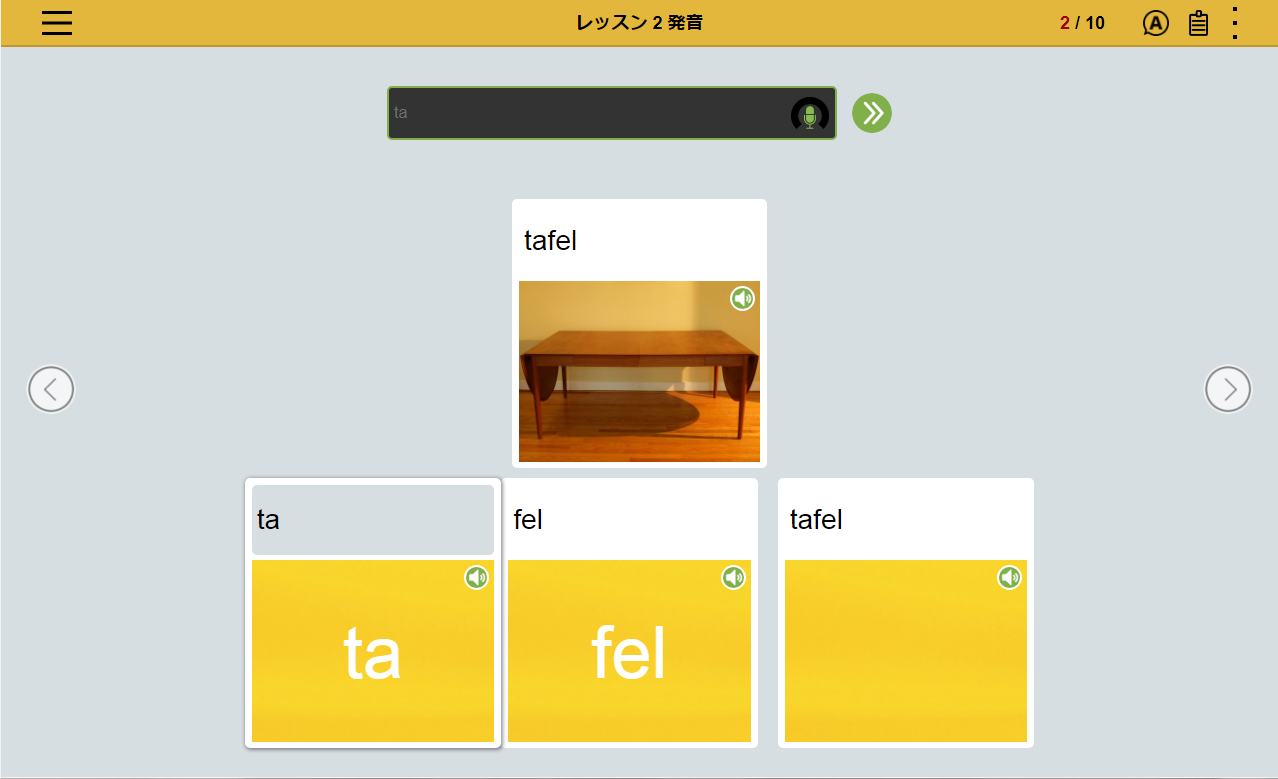 - 日常で利用する単語を使った会話トレーニングを行ないます。レベル1は「こんにちは」「男の子」「女の子」といった基本単語からはじまり、日常会話レベルまで段階的に身につけます。基本的な会話レベルからスタートするのは、日本語に訳さず、その言語で考え、表現できる土台を築くことが目的です。