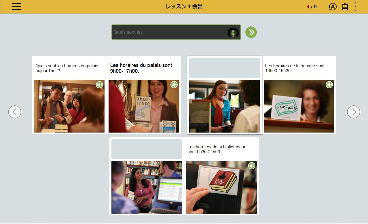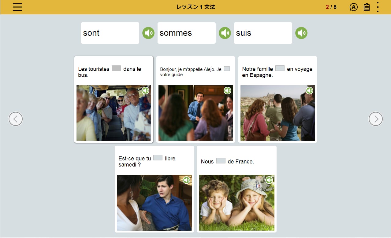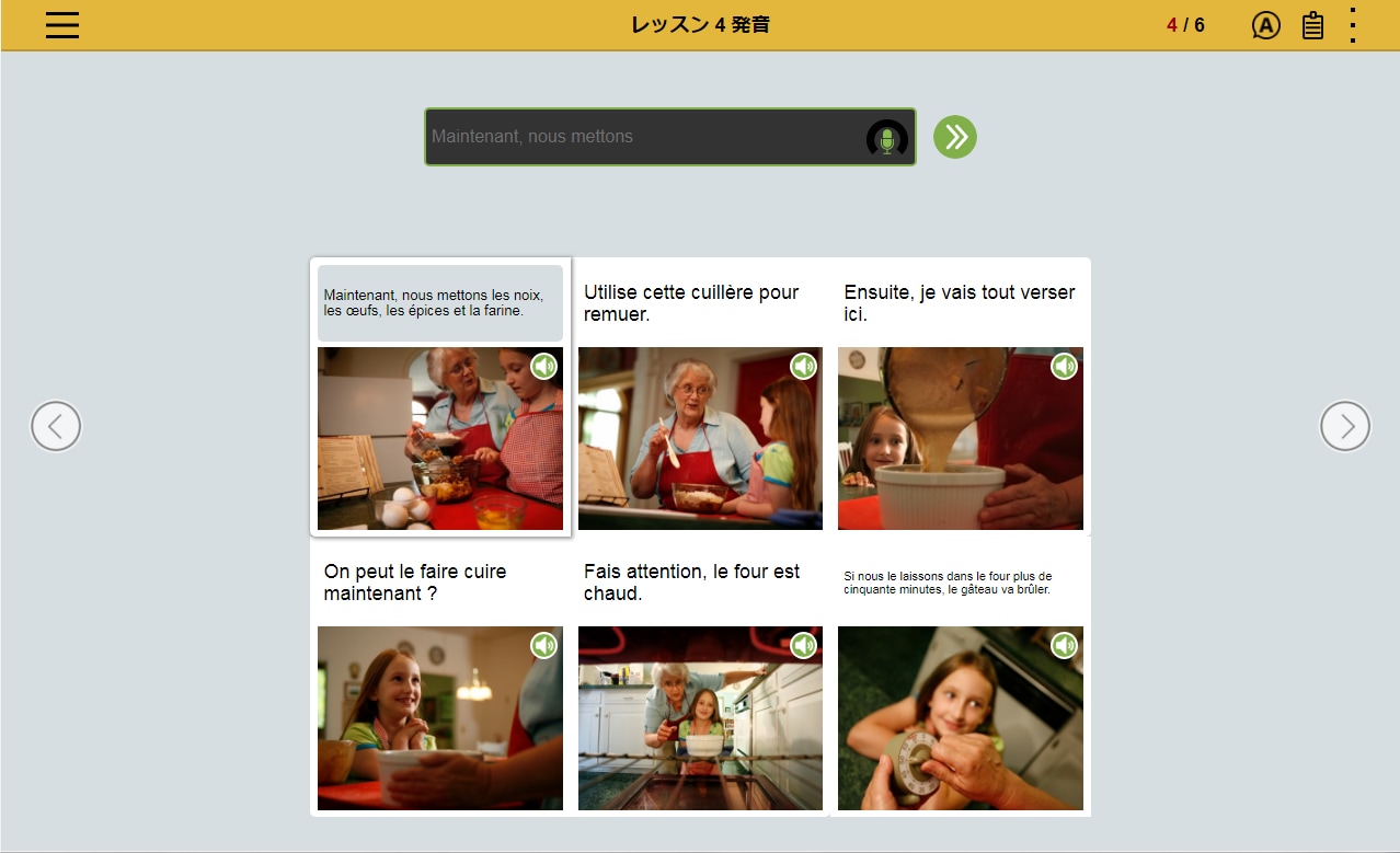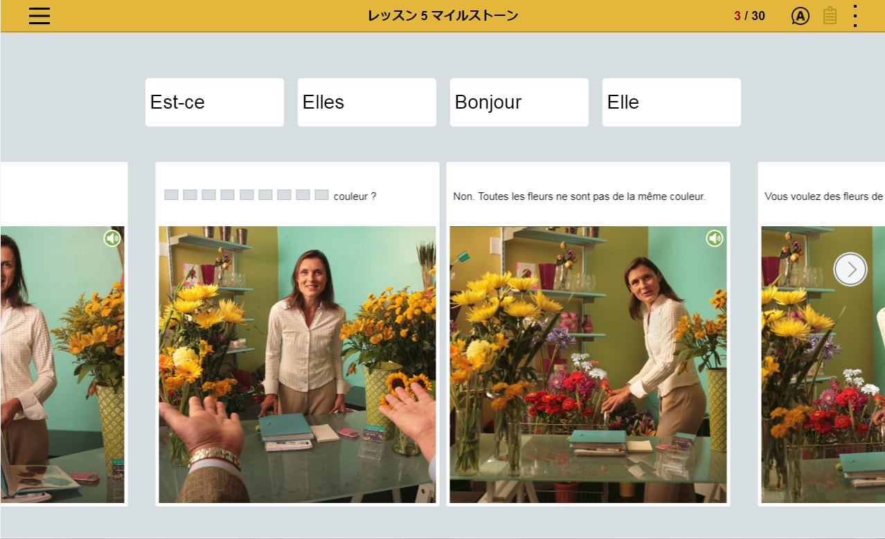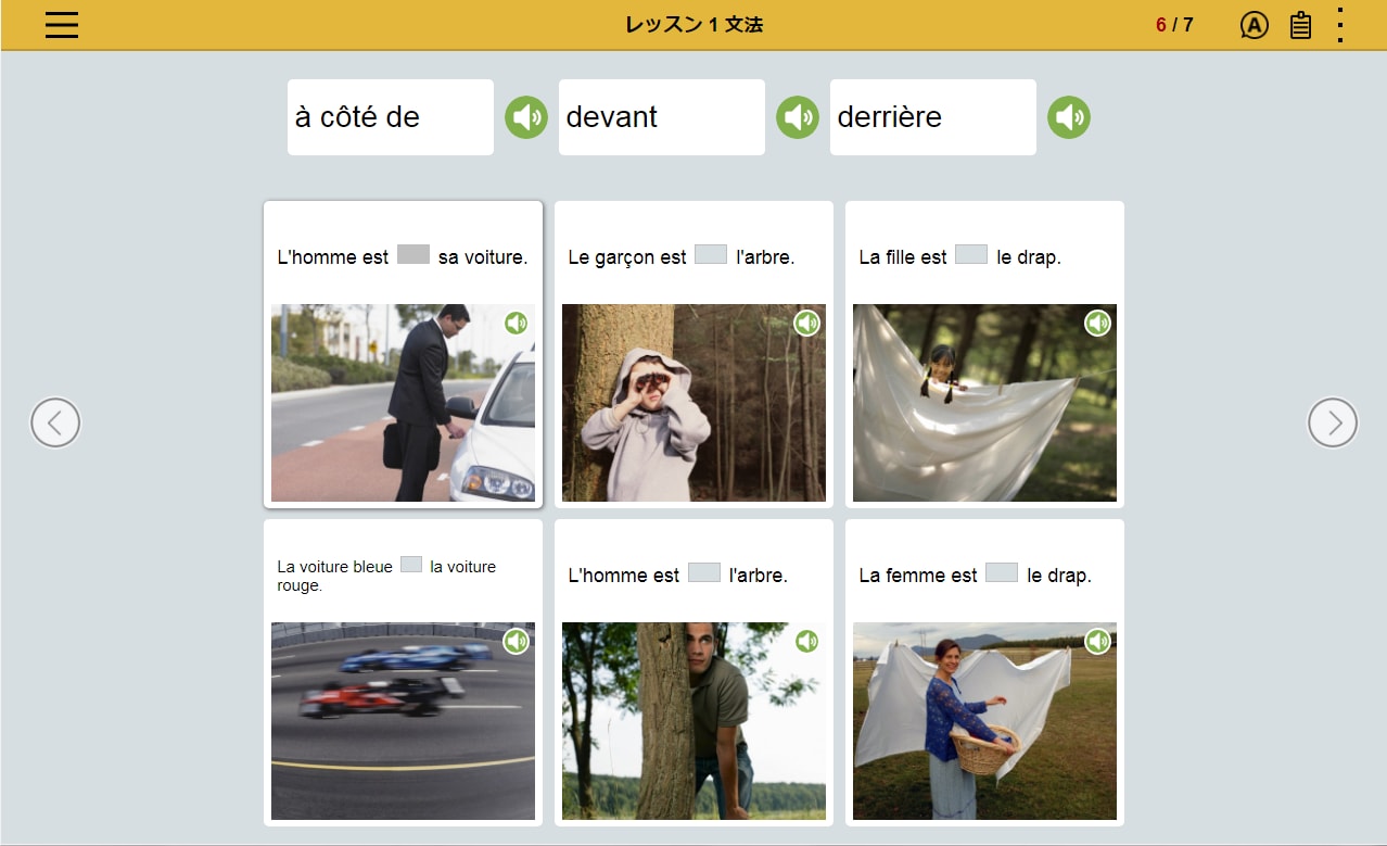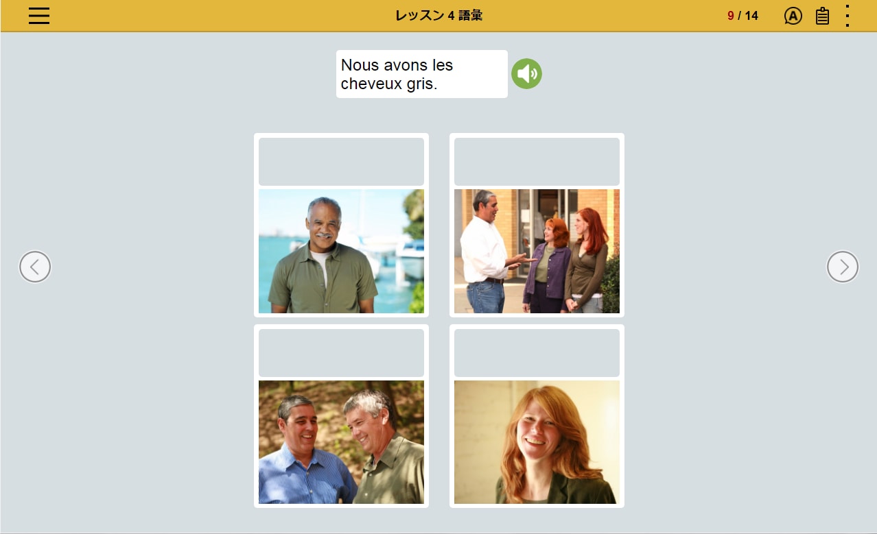 フランス語の文章を読み、文章の内容にあった写真を選択。文章とシチュエーションを直感的に結びつけるレッスンの繰り返しによって、 感情表現など複雑な表現を身につけます。
