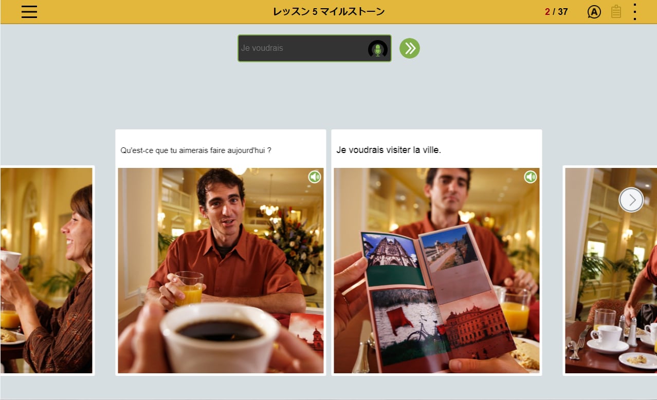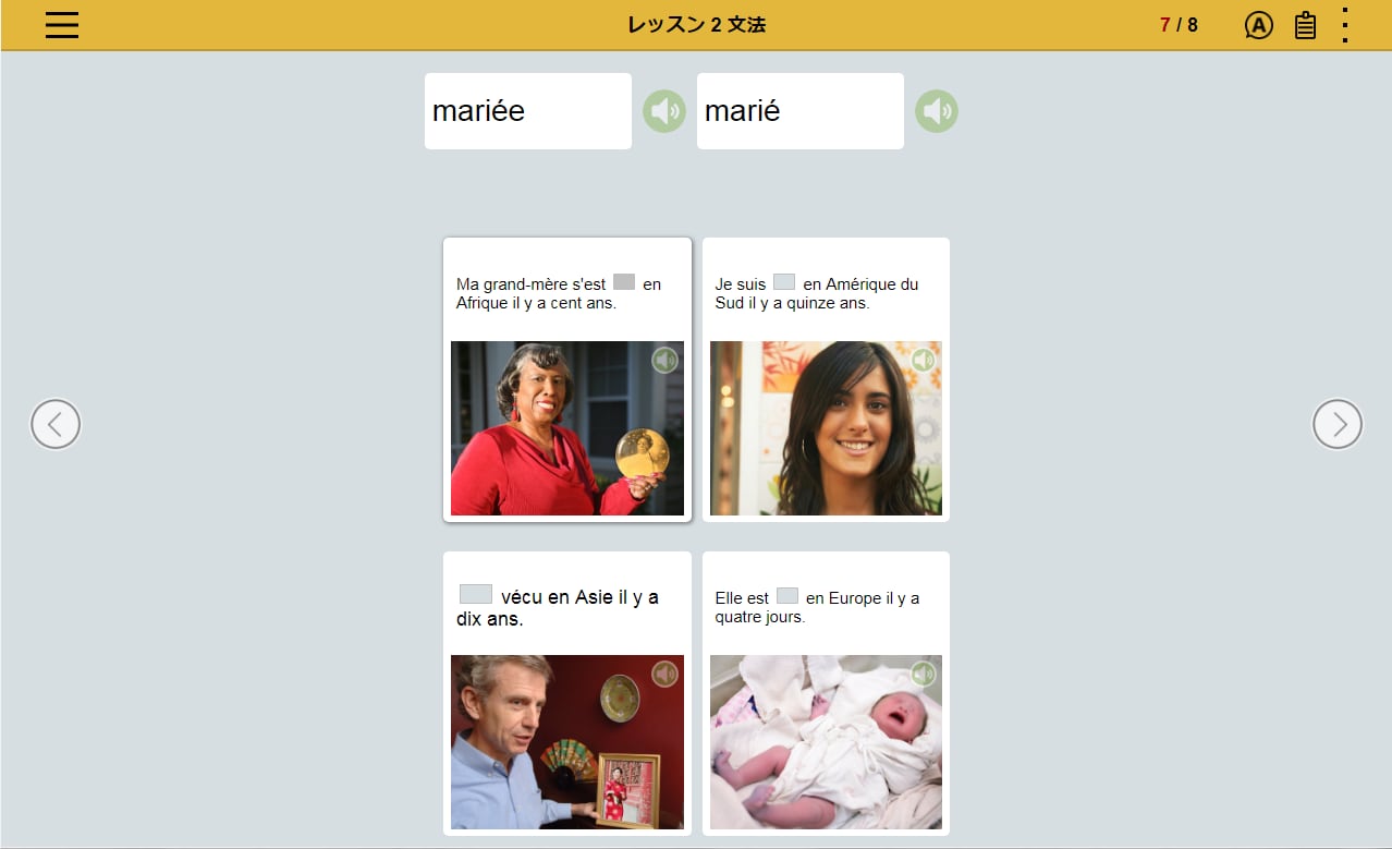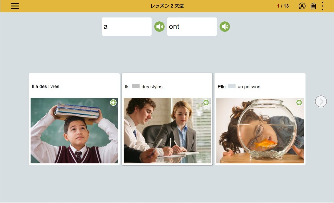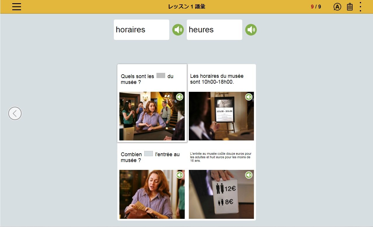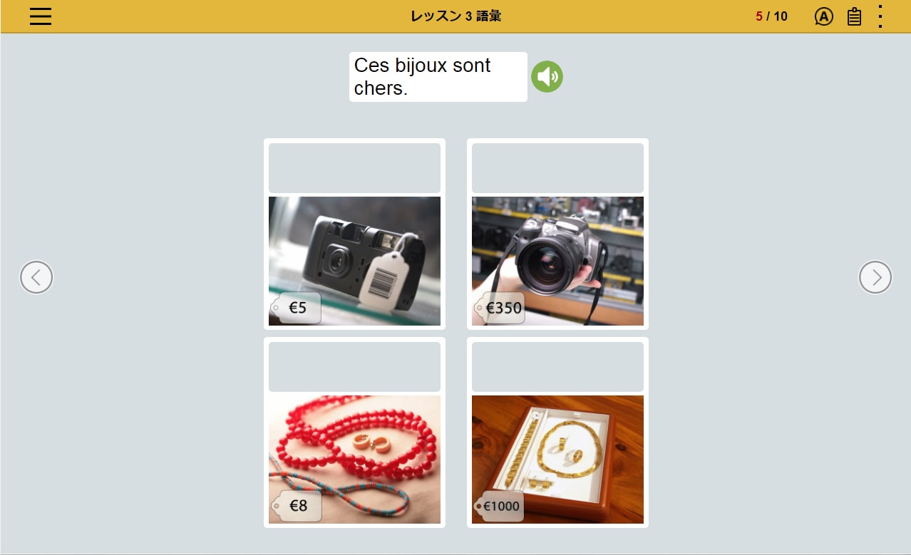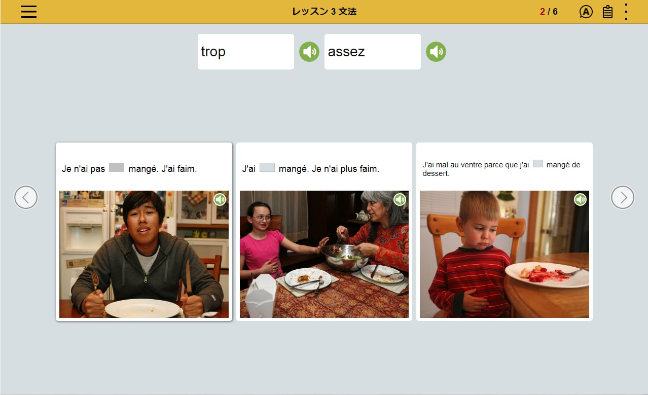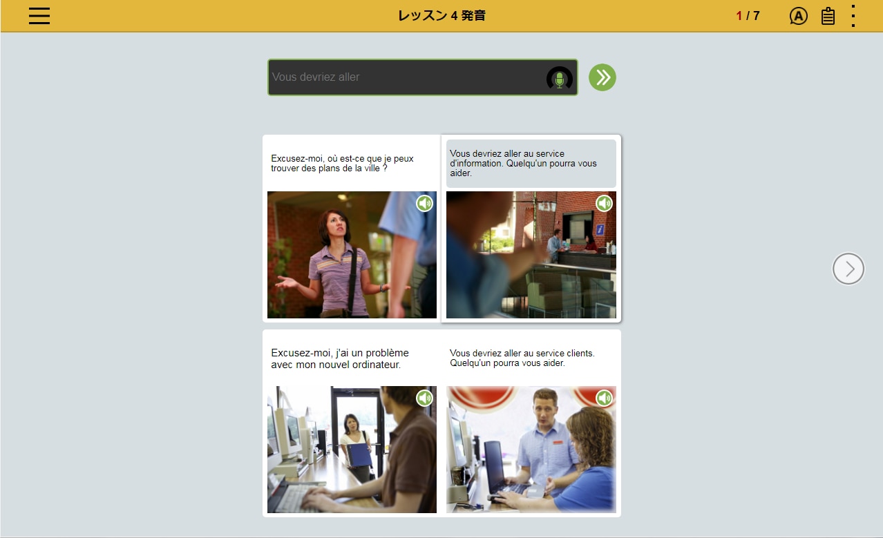 フランス語の文章を読み、文章の内容にあった写真を選択。文章とシチュエーションを直感的に結びつけるレッスンの繰り返しによって、 感情表現など複雑な表現を身につけます。