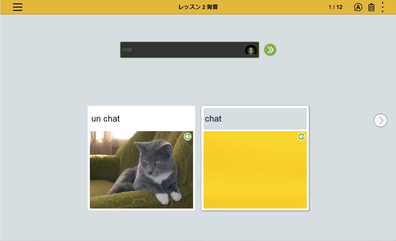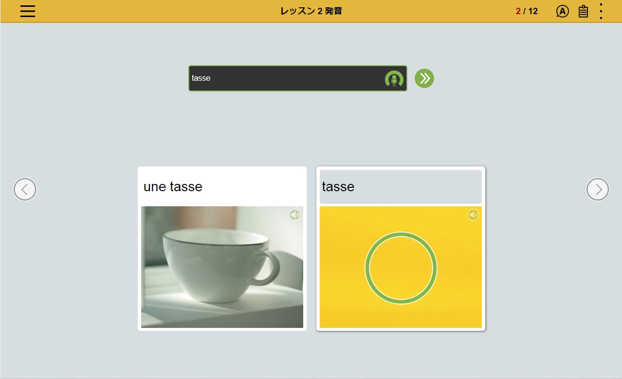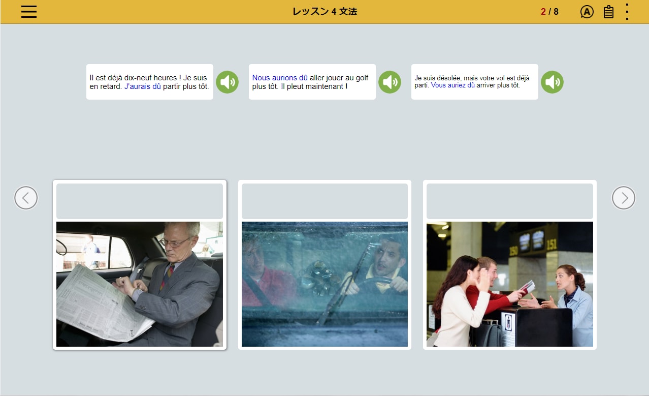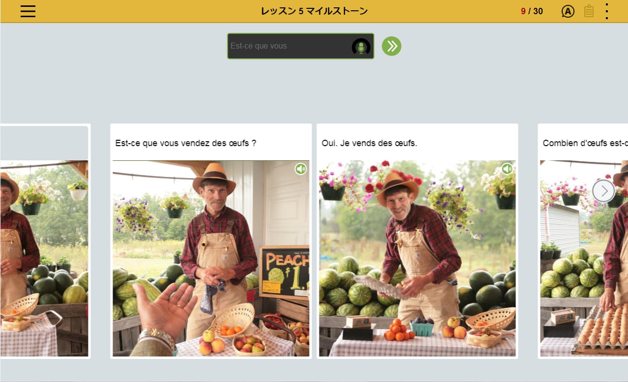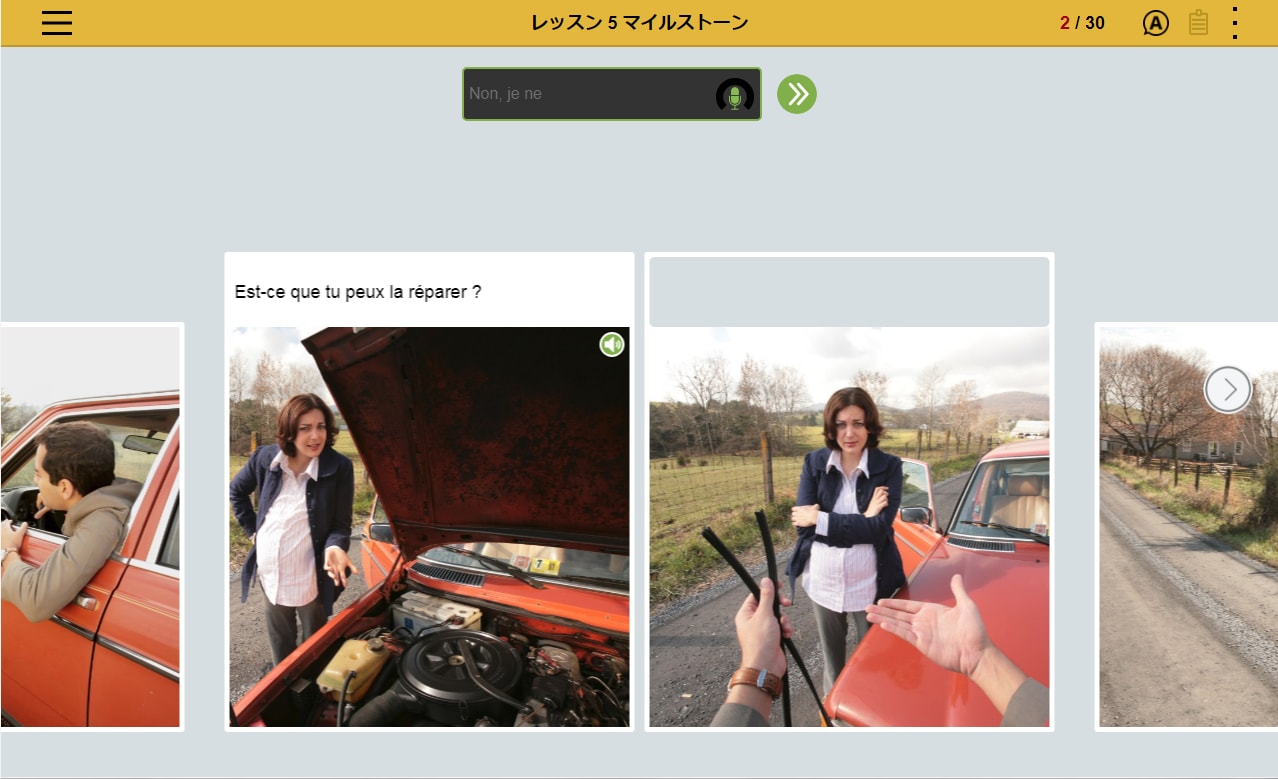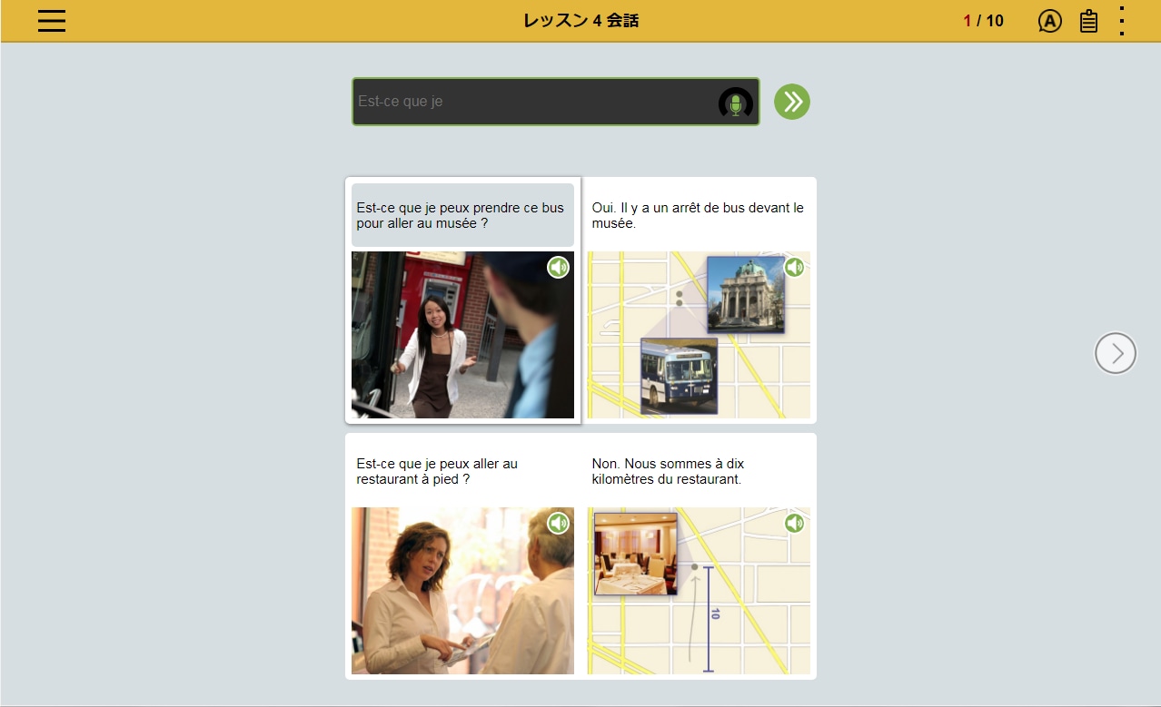 フランス語の文章を読み、文章の内容にあった写真を選択。文章とシチュエーションを直感的に結びつけるレッスンの繰り返しによって、 感情表現など複雑な表現を身につけます。
