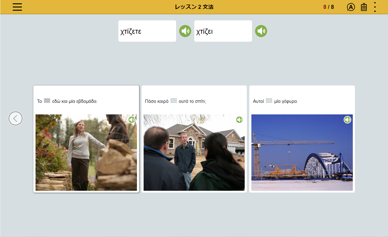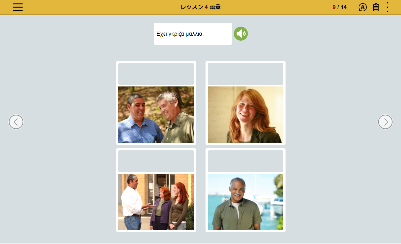 - 日常で利用する単語を使った会話トレーニングを行ないます。レベル1は「こんにちは」「男の子」「女の子」といった基本単語からはじまり、日常会話レベルまで段階的に身につけます。基本的な会話レベルからスタートするのは、日本語に訳さず、その言語で考え、表現できる土台を築くことが目的です。