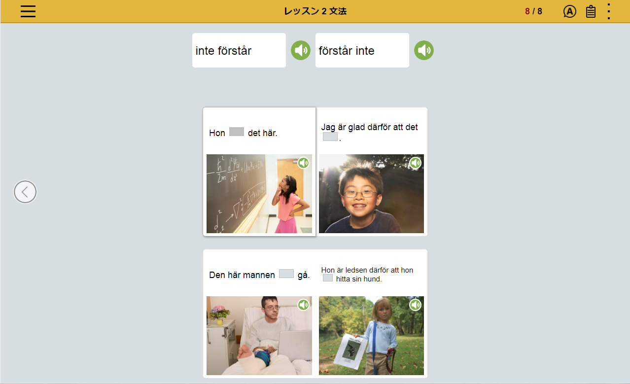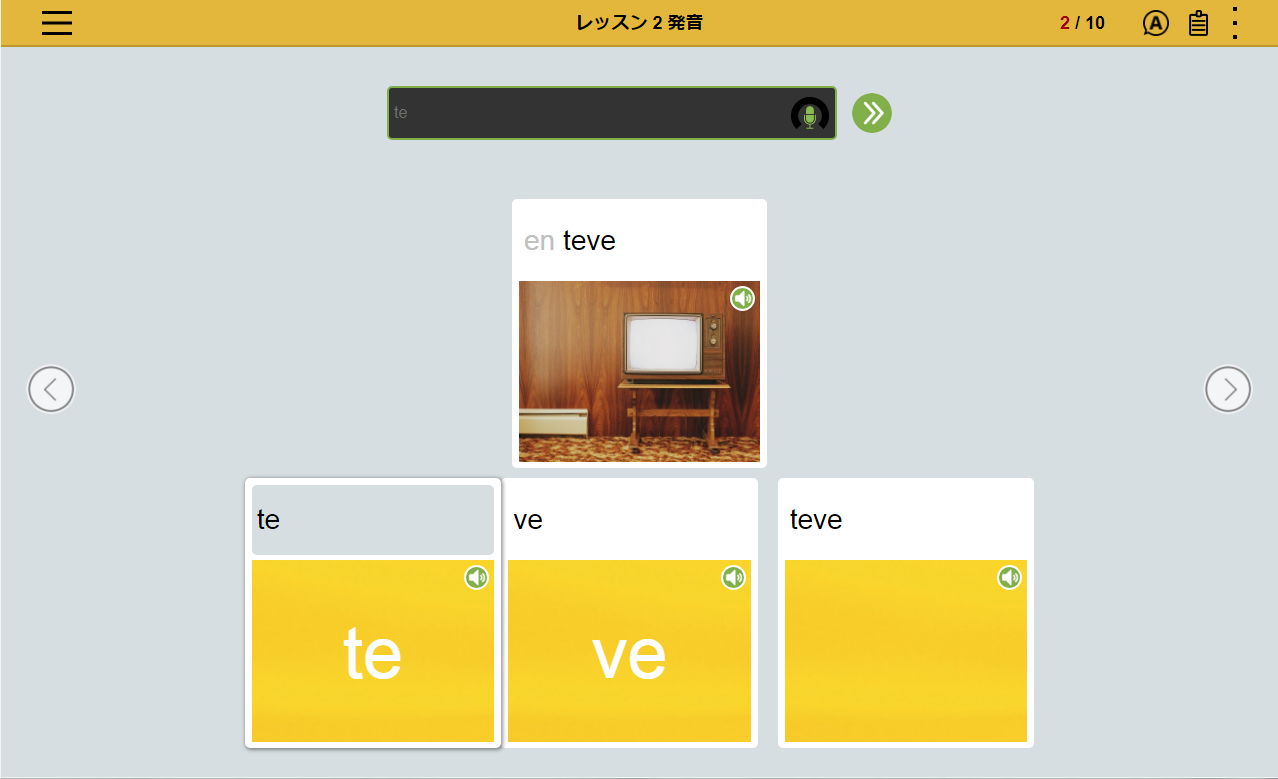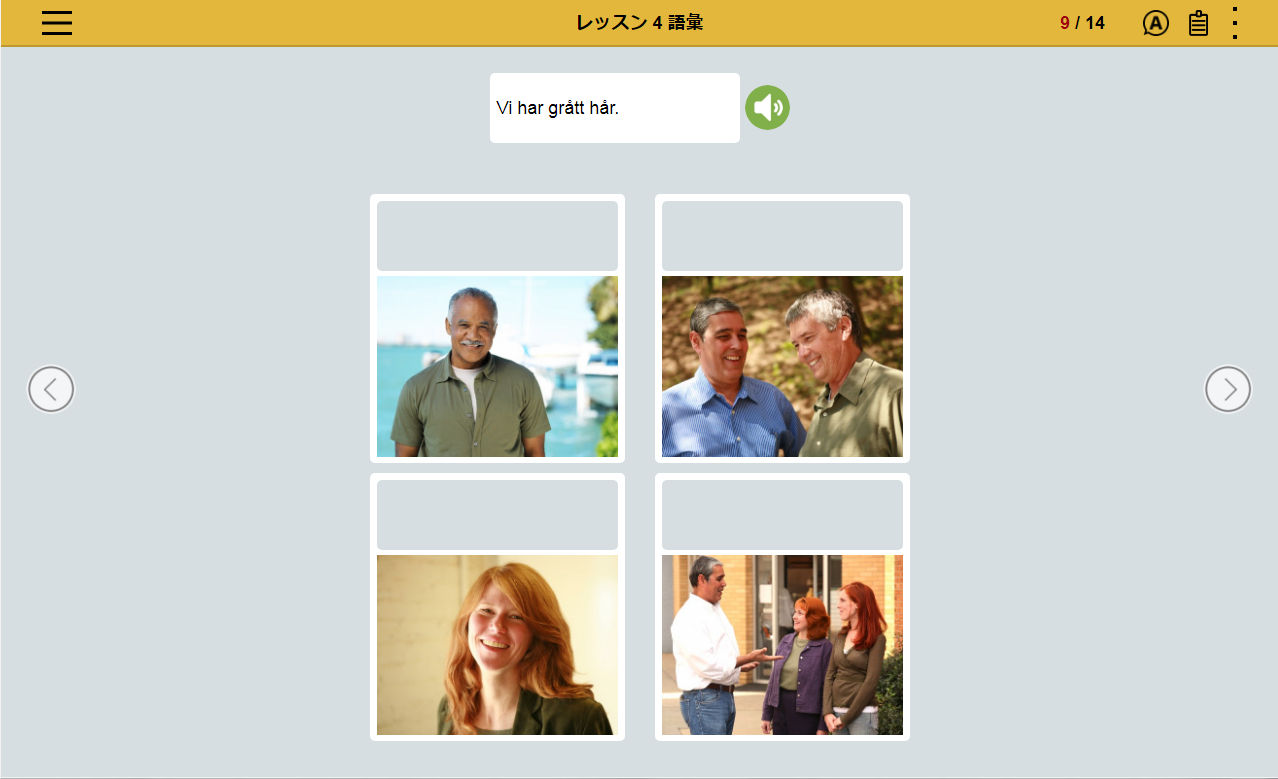 - 日常で利用する単語を使った会話トレーニングを行ないます。レベル1は「こんにちは」「男の子」「女の子」といった基本単語からはじまり、日常会話レベルまで段階的に身につけます。基本的な会話レベルからスタートするのは、日本語に訳さず、その言語で考え、表現できる土台を築くことが目的です。